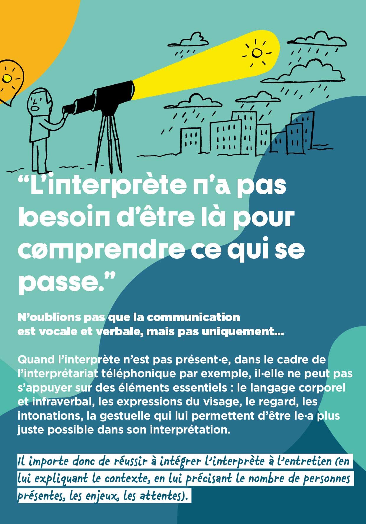 N’oublions pas que la communication est vocale et verbale, mais pas uniquement… Quand l’interprète n’est pas présent·e, dans le cadre de l’interprétariat téléphonique par exemple, il.elle ne peut pas s’appuyer sur des éléments essentiels : le langage corporel et infraverbal, les expressions du visage, le regard, les intonations, la gestuelle qui lui permettent d’être le·a plus juste possible dans son interprétation. Il importe donc de réussir à intégrer l’interprète à l’entretien (en lui expliquant le contexte, en lui précisant le nombre de personnes présentes, les enjeux, les attentes).