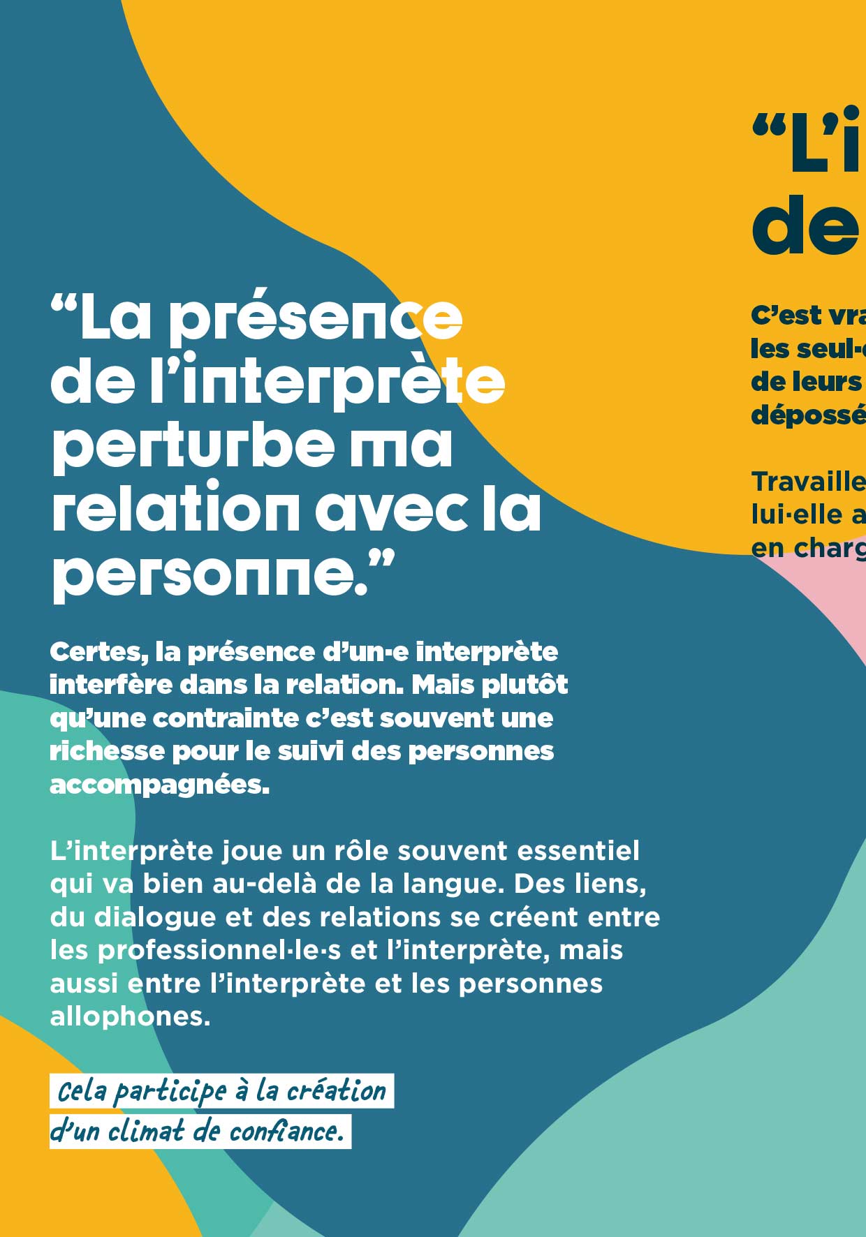 Certes, la présence d’un·e interprète interfère dans la relation. Mais plutôt qu’une contrainte c’est souvent une richesse pour le suivi des personnes accompagnées. L’interprète joue un rôle souvent essentiel qui va bien au-delà de la langue. Des liens, du dialogue et des relations se créent entre les professionnel·le·s et l’interprète, mais aussi entre l’interprète et les personnes allophones. Cela participe à la création d’un climat de confiance.