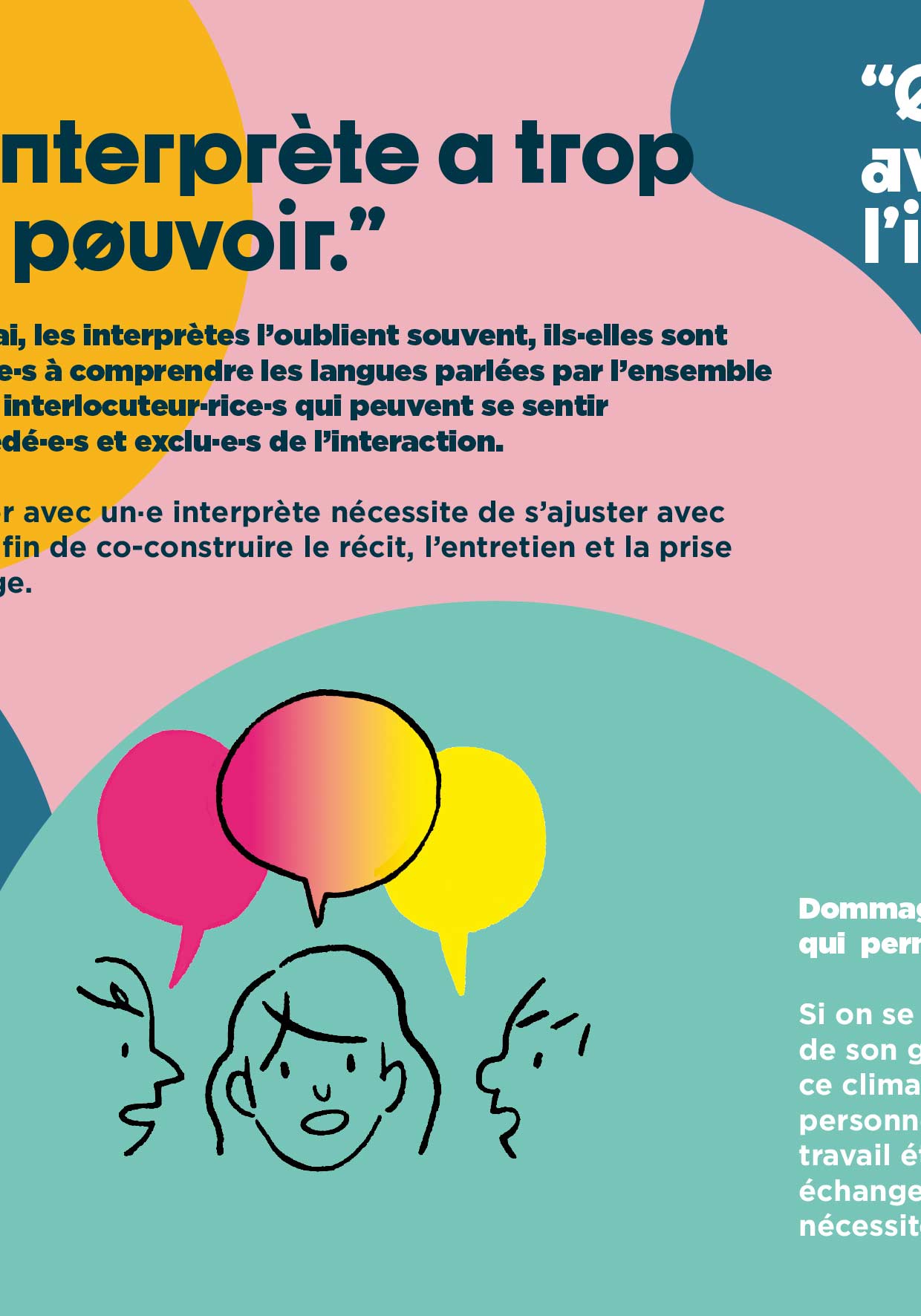 C’est vrai, les interprètes l’oublient souvent, ils·elles sont les seul·e·s à comprendre les langues parlées par l’ensemble de leurs interlocuteur·rice·s qui peuvent se sentir dépossédé·e·s et exclu·e·s de l’interaction.