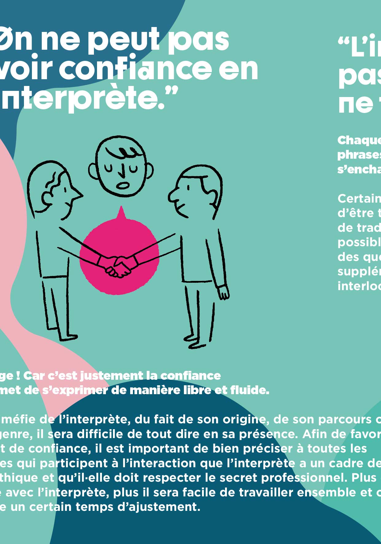 Dommage ! Car c’est justement la confiance qui permet de s’exprimer de manière libre et fluide. Si on se méfie de l’interprète, du fait de son origine, de son parcours ou de son genre, il sera difficile de tout dire en sa présence. Afin de favoriser ce climat de confiance, il est important de bien préciser à toutes les personnes qui participent à l’interaction que l’interprète a un cadre de travail éthique et qu’il doit respecter le secret professionnel. Plus on échange avec l’interprète, plus il sera facile de travailler ensemble et cela nécessite un certain temps d’ajustement.