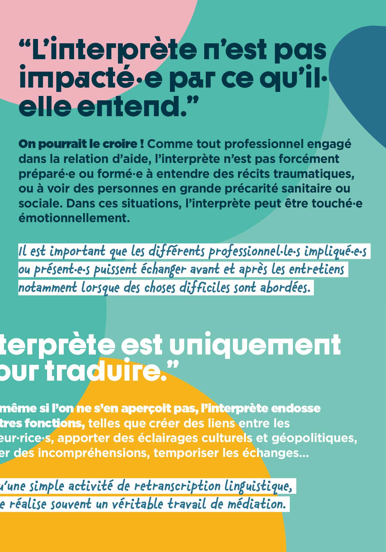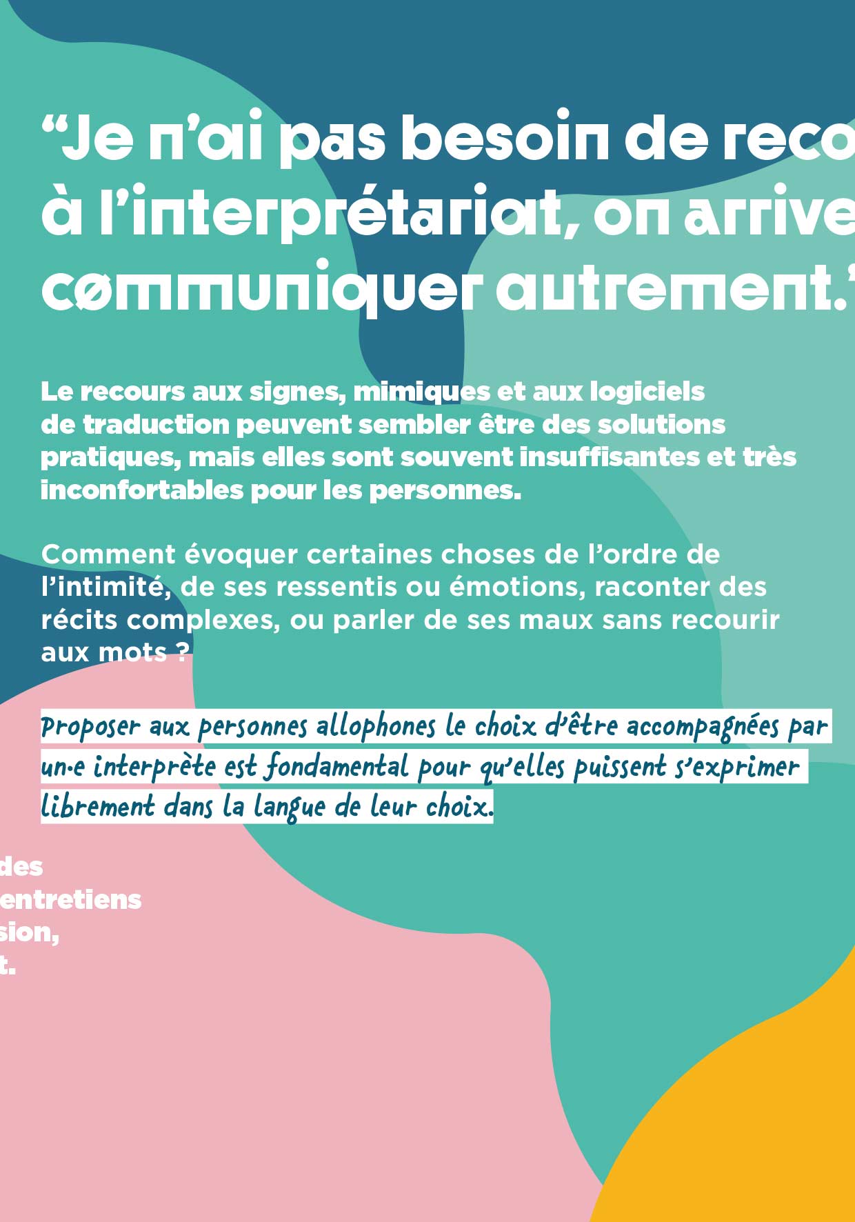 Ce livret est avant tout une invitation à la rencontre et à la réflexion. Nous espérons qu’il vous permettra de porter un regard nouveau sur les innombrables possibilités et avantages que le recours à l’interprétariat peut offrir, car au-delà des problématiques qu’il soulève, l’interprétariat apporte des solutions concrètes et un soutien réel au suivi des personnes allophones.