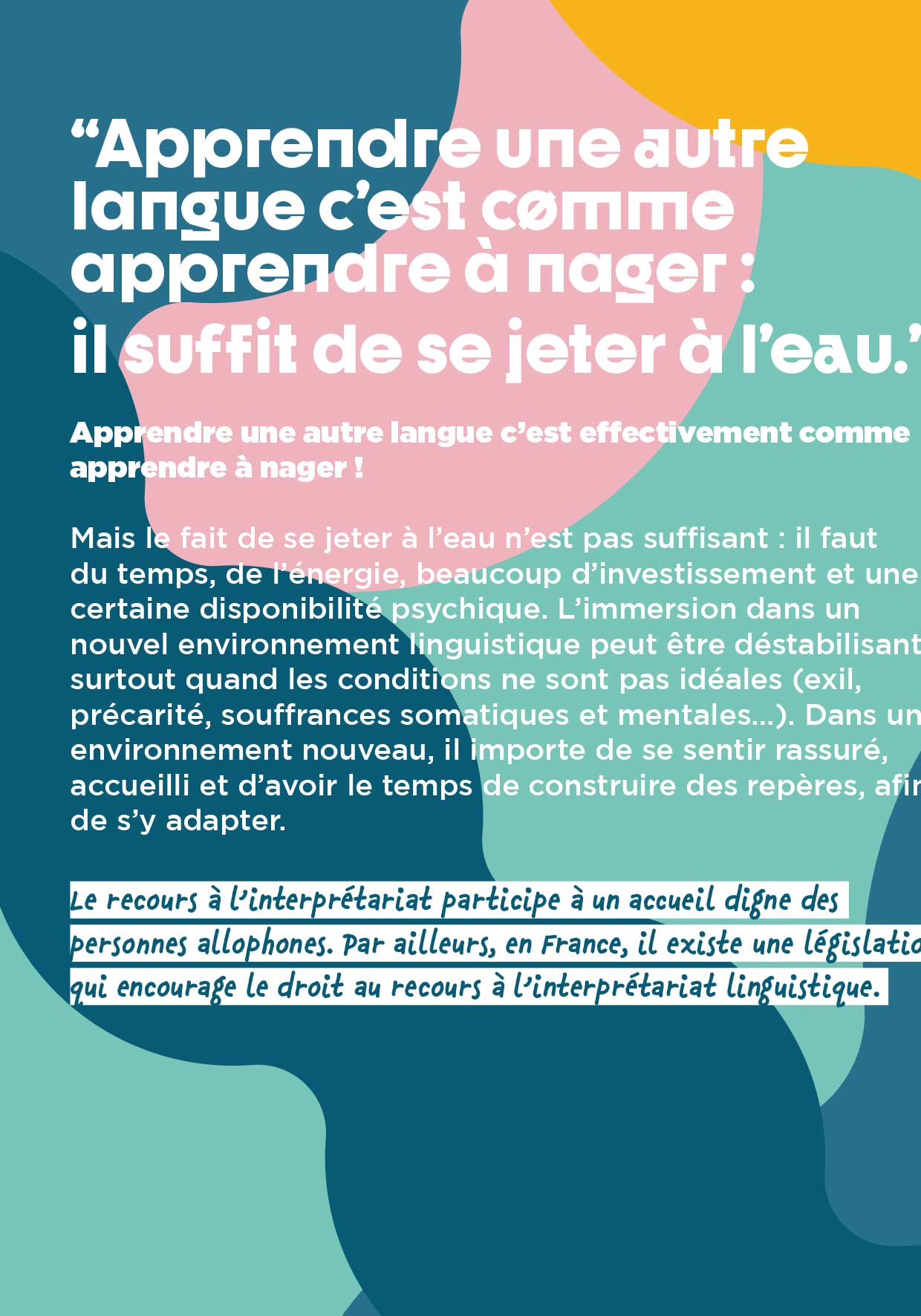 Apprendre une autre langue c’est effectivement comme apprendre à nager ! Il faut du temps, de l’énergie, beaucoup d’investissement et une certaine disponibilité psychique. L’immersion dans un nouvel environnement linguistique peut être déstabilisant????, surtout quand les conditions ne sont pas idéales (exil, précarité, souffrances somatiques et mentales…). Dans un environnement nouveau, il importe de se sentir rassuré, de s’y adapter. Le recours à l’interprétariat participe à un accueil digne des personnes allophones. Par ailleurs, en France, il existe une législation qui encourage le droit au recours à l’interprétariat linguistique.